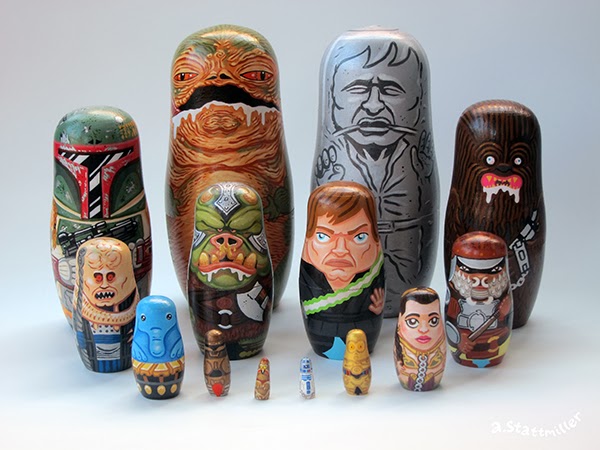 "Star Wars Return of the Jedi Nesting dolls are here! It's the Jabba the Hutt Palace scene. It's two sets of 7 pieces, one is the good guys and one is the bad guys. In the bad guys set (left), from biggest to smallest you have Jabba the Hutt, Boba Fett, Gamorrean Guard, Bib Fortuna, Max Rebo, EV-9D9, and Salacious B. Crumb. In the good guys set (right), from biggest to smallest you have Han Solo (frozen in carbonite), Chewbacca, Luke Skywalker, Lando Calrissian, Princess Leia, C-3PO and R2-D2.